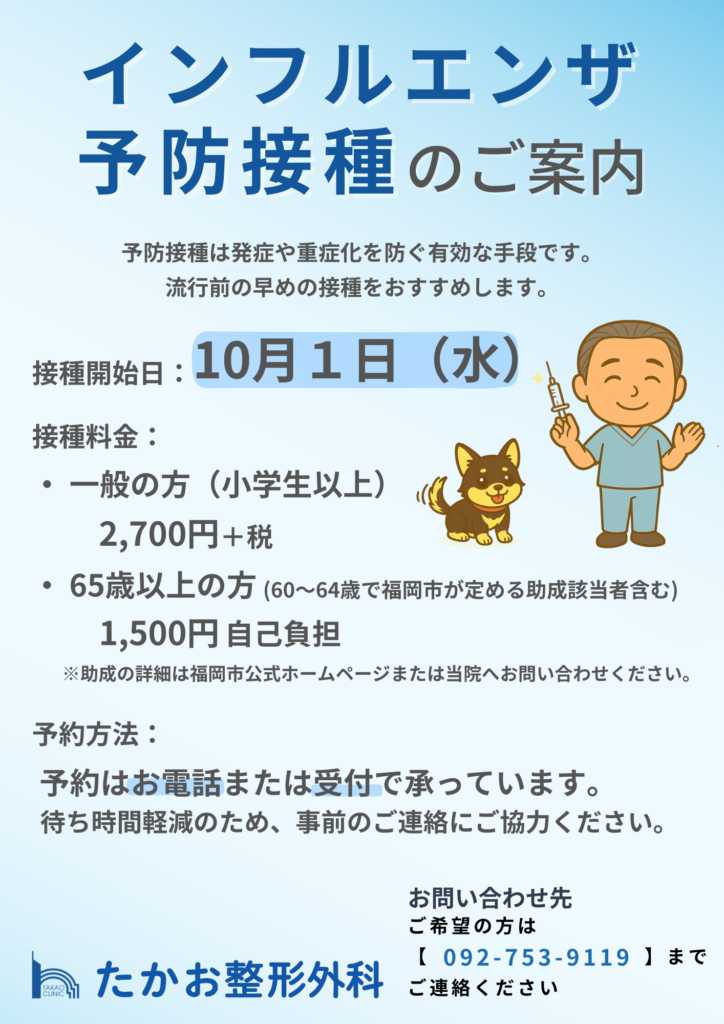 ワクチン2025年9月18日【10月1日より】インフルエンザ予防接種を開始します|福岡市中央区 たかお整形外科